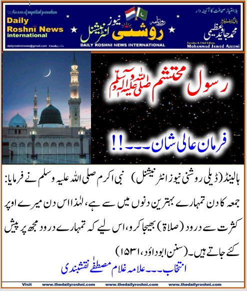 فرمان عالی شان ۔۔۔!! / ہالینڈ کی خبریں, فرمان رسول / By Daily Roshni News ہالینڈ(ڈیلی روشنی نیوز انٹرنیشنل) نبی اکرم صلی اللہ علیہ وسلم نے فرمایا: جمعہ کا دن تمہارے بہترین دنوں میں سے ہے، لہٰذا اس دن میرے اوپر کثرت سے درود ( صلاۃ ) بھیجا کرو، اس لیے کہ تمہارے درود مجھ پر پیش کئے جاتے ہیں ۔ (سنن ابوداؤد ،۱۵۳۱) جمعہ مبارک