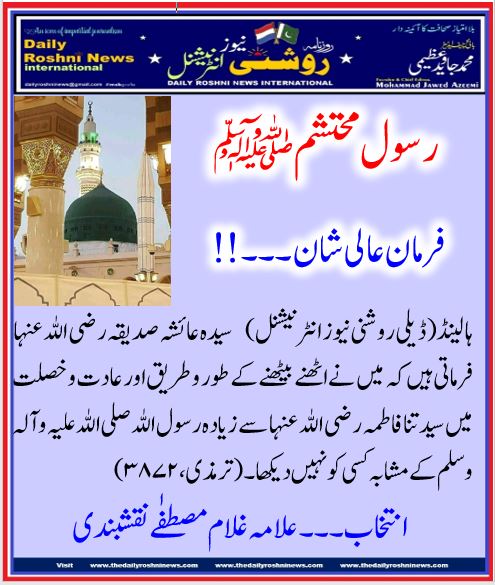 فرمان عالی شان ۔۔۔!! / ہالینڈ کی خبریں, فرمان رسول / By Daily Roshni News ہالینڈ(ڈیلی روشنی نیوز انٹرنیشنل) سیدہ عائشہ صدیقہ رضی اللہ عنہا فرماتی ہیں کہ میں نے اٹھنے بیٹھنے کے طور و طریق اور عادت و خصلت میں سیدتنا فاطمہ رضی اللہ عنہا سے زیادہ رسول اللہ صلی اللہ علیہ وآلہ وسلم کے مشابہ کسی کو نہیں دیکھا۔ (ترمذی،۳۸۷۲)