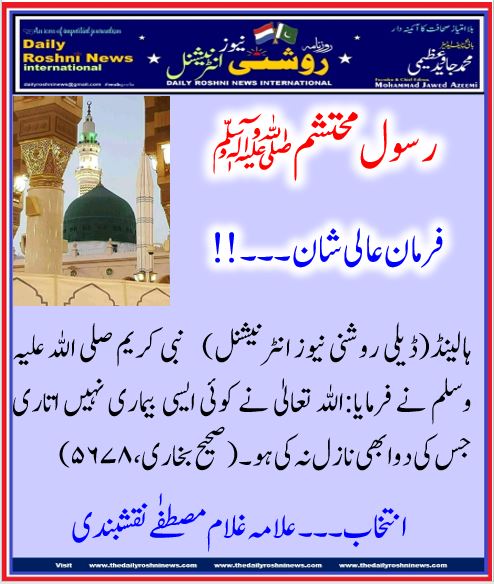 ‏ہالینڈ(ڈیلی روشنی نیوز انٹرنیشنل) ‏نبی کریم صلی اللہ علیہ وسلم نے فرمایا:‏اللہ تعالیٰ نے کوئی ایسی بیماری نہیں اتاری جس کی دوا بھی نازل نہ کی ہو۔  ‏(صحیح بخاری،۵۶۷۸)