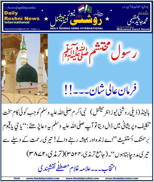 ہالینڈ(ڈیلی روشنی نیوز انٹرنیشنل) نبی اکرم صلی اللہ علیہ وسلم کو جب کوئی کام سخت تکلیف و پریشانی میں ڈال دیتا تو آپ صلی اللہ علیہ وسلم یہ دعا پڑھتے:“يا حي يا قيوم برحمتك أستغيث ”اے زندہ اور ہمیشہ رہنے والے! تیری رحمت کے وسیلے سے تیری مدد چاہتا ہوں“۔ (جامع ترمذی ،۳۵۲۴)(ترمذی،۳۸۷۲)