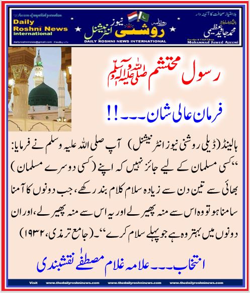 ہالینڈ(ڈیلی روشنی نیوز انٹرنیشنل) آپ صلی اللہ علیہ وسلم نے فرمایا: “کسی مسلمان کے لیے جائز نہیں کہ اپنے ( کسی دوسرے مسلمان ) بھائی سے تین دن سے زیادہ سلام کلام بند رکھے، جب دونوں کا آمنا سامنا ہو تو وہ اس سے منہ پھیر لے اور یہ اس سے منہ پھیر لے، اور ان دونوں میں بہتر وہ ہے جو پہلے سلام کرے“۔(جامع ترمذی،۱۹۳۲)