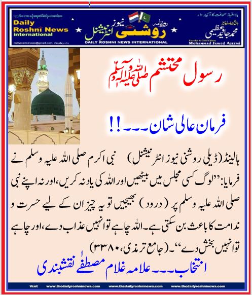 ہالینڈ(ڈیلی روشنی نیوز انٹرنیشنل) نبی اکرم صلی اللہ علیہ وسلم نے فرمایا:”لوگ کسی مجلس میں بیٹھیں اور اللہ کی یاد نہ کریں، اور نہ اپنے نبی صلی اللہ علیہ وسلم پر ( درود ) بھیجیں تو یہ چیز ان کے لیے حسرت و ندامت کا باعث بن سکتی ہے۔ اللہ چاہے تو انہیں عذاب دے، اور چاہے تو انہیں بخش دے“۔ (جامع ترمذی،۳۳۸۰)