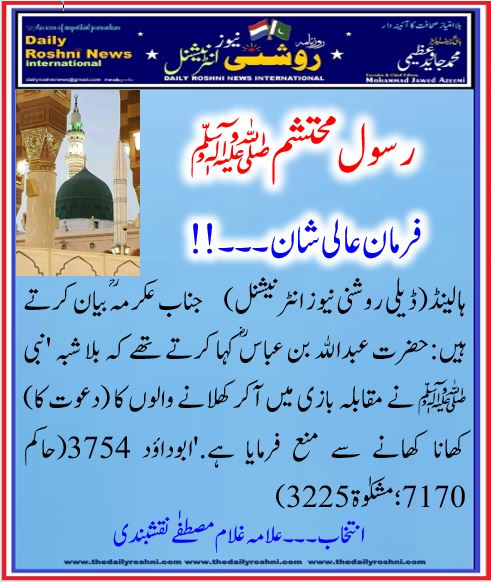 فرمان عالی شان ۔۔۔!! / ہالینڈ کی خبریں, فرمان رسول / By Daily Roshni News ہالینڈ(ڈیلی روشنی نیوز انٹرنیشنل) جناب عکرمہ ؒ بیان کرتے ہیں:حضرت عبدالله بن عباس ؓ کہا کرتے تھے کہ بلا شبہ ‘نبی ﷺ نے مقابلہ بازی میں آکر کھلانے والوں کا (دعوت کا) کھانا کھانے سے منع فرمایا ہے.’ابوداؤد 3754(حاکم 7170؛ مشکوٰۃ 3225)