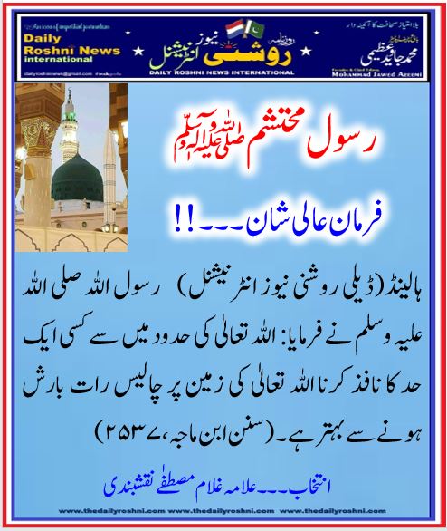 فرمان عالی شان ۔۔۔!! / Uncategorized / By Daily Roshni News ہالینڈ(ڈیلی روشنی نیوز انٹرنیشنل) رسول اللہ صلی اللہ علیہ وسلم نے فرمایا: اللہ تعالیٰ کی حدود میں سے کسی ایک حد کا نافذ کرنا اللہ تعالیٰ کی زمین پر چالیس رات بارش ہونے سے بہتر ہے ۔ (سنن ابن ماجہ،۲۵۳۷)