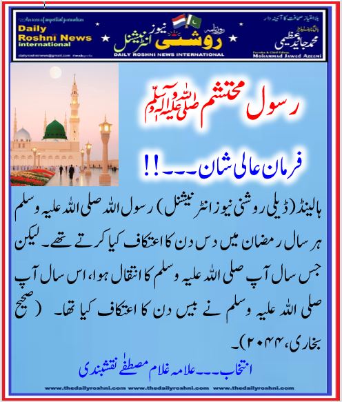 فرمان عالی شان ۔۔۔!! / ہالینڈ کی خبریں, فرمان رسول / By Daily Roshni News ہالینڈ(ڈیلی روشنی نیوز انٹرنیشنل) رسول اللہ صلی اللہ علیہ وسلم ہر سال رمضان میں دس دن کا اعتکاف کیا کرتے تھے۔ لیکن جس سال آپ صلی اللہ علیہ وسلم کا انتقال ہوا، اس سال آپ صلی اللہ علیہ وسلم نے بیس دن کا اعتکاف کیا تھا۔ (صحیح بخاری،۲۰۴۴)۔