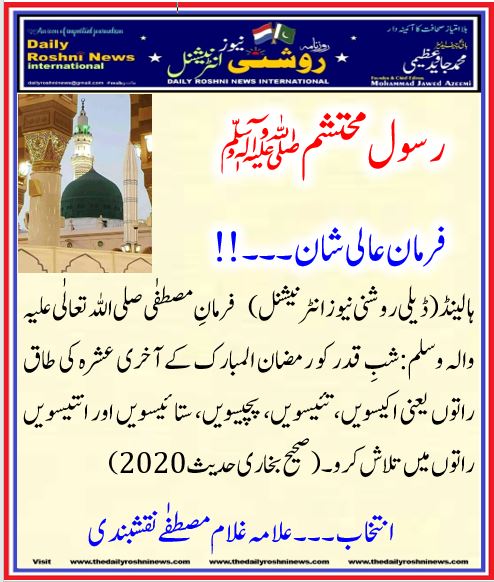 فرمان عالی شان ۔۔۔!! / ہالینڈ کی خبریں, فرمان رسول / By Daily Roshni News ہالینڈ(ڈیلی روشنی نیوز انٹرنیشنل) فرمانِ مصطفٰی صلی اللہ تعالٰی علیہ والہ وسلم: شبِ قدر کو رمضان المبارک کے آخری عشرہ کی طاق راتوں یعنی اکیسویں، تئیسویں، پچیسویں، ستائیسویں اور انتیسویں راتوں میں تلاش کرو۔ (صحیح بخاری حدیث 2020)