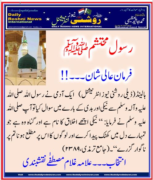 ‏ہالینڈ(ڈیلی روشنی نیوز انٹرنیشنل) ‏ایک آدمی نے رسول اللہ صلی اللہ علیہ وآلہ  وسلم سے نیکی اور بدی کے بارے میں سوال کیا تو آپ صلی اللہ علیہ وسلم نے فرمایا: ‏“ نیکی اچھے اخلاق کا نام ہے اور گناہ وہ ہے جو تمہارے دل میں کھٹک پیدا کرے اور لوگوں کا اس پر مطلع ہونا تم پر ناگوار گزرے“ ۔ ‏ (جامع ترمذی، ۲۳۸۹)