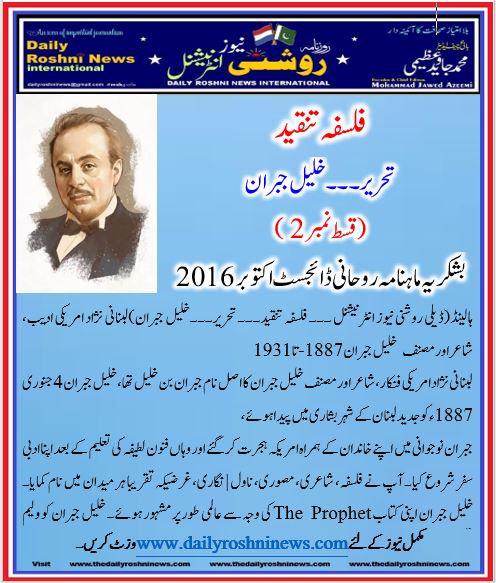 ہالینڈ(ڈیلی روشنی نیوز انٹرنیشنل ۔۔۔ فلسفہ تنقید۔۔۔ تحریر۔۔۔خلیل جبران)لبنانی نژاد امریکی ادیب، شاعر اور مصنف خلیل جبران 1887-تا1931