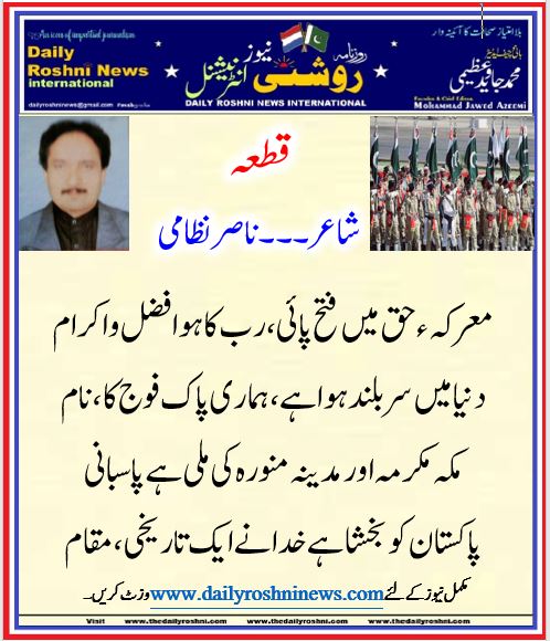 قطعہ ۔۔شاعر۔۔۔ناصر نظامی / ہالینڈ کی خبریں, شعرو ادب, ناصر نظامی کی شاعری / By Daily Roshni News معرکہء حق میں فتح پائی، رب کا ہوا فضل واکرام دنیا میں سر بلند ہوا ہے، ہماری پاک فوج کا ، نام مکہ مکرمہ اور مدینہ منورہ کی ملی ہے پاسبانی پاکستان کو بخشا ہے خدا نے ایک تاریخی ، مقام ناصر نظامی