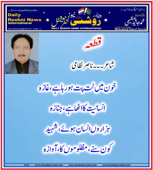 قطعہ ۔۔شاعر۔۔۔ناصر نظامی / ہالینڈ کی خبریں, شعرو ادب, ناصر نظامی کی شاعری / By Daily Roshni News قطعہ شاعر۔۔۔ناصر نظامی خون میں لت پت ہو رہا ہے ، غازہ انسانیت کا اٹھا ہے ، جنازہ ہزاروں انسان ہوئے ، شہید کون سنے، مظلوموں کا ، آ وا زہ ناصر نظامی ایمسٹرڈیم ہالینڈ