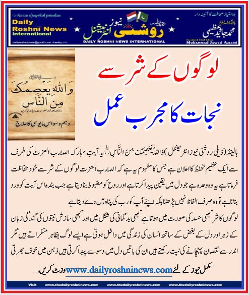 ہالینڈ(ڈیلی روشنی نیوز انٹرنیشنل )وَ اللّٰهُ یَعْصِمُكَ مِنَ النَّاسِؕیہ آیتِ مبارکہ اللّٰہ رب العزت کی طرف سے ایک عظیم تحفظ کا اعلان ہے جس کا مفہوم یہ ہے کہ اللّٰہ رب العزت لوگوں کے شر سے خود حفاظت فرماتا ہے یہ وہ وعدہ ہے جو دل میں یقین پیدا کرتا ہے اور روح کو مضبوط بنا دیتا ہے جب بندہ اس آیت کو ورد بناتا ہے تو وہ صرف الفاظ نہیں پڑھتا بلکہ اپنے آپ کو رب کی پناہ میں دے دیتا ہے