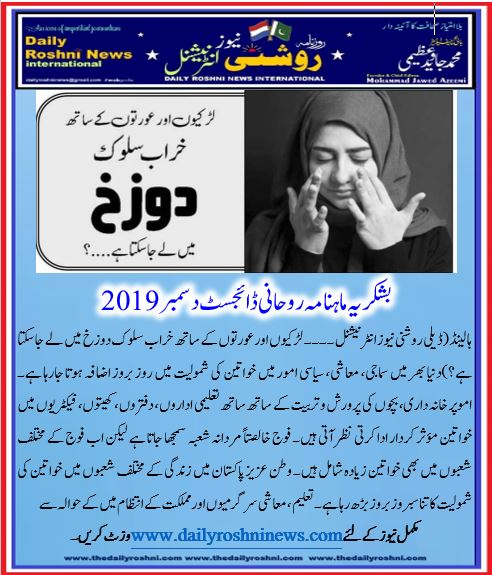 ہالینڈ(ڈیلی روشنی نیوز انٹرنیشنل ۔۔۔۔ لڑکیوں اور عورتوں کے ساتھ خراب سلوک دوزخ میں لے جاسکتا ہے؟)دنیا بھر میں سماجی، معاشی، سیاسی امور میں خواتین کی شمولیت میں روز بروز اضافہ ہوتا جارہا ہے۔ اموپر خانہ داری، بچوں کی پرورش و تربیت کے ساتھ ساتھ تعلیمی اداروں، دفتروں، کھیتوں، فیکٹریوں میں خواتین مؤثر کردار ادا کرتی نظر آتی ہیں۔ فوج خالصتاً مردانہ شعبہ سمجھا جاتا ہے لیکن اب فوج کے مختلف شعبوں میں بھی خواتین زیادہ شامل ہیں۔ وطن عزیز پاکستان میں زندگی کے مختلف شعبوں میں خواتین کی شمولیت کا تناسبروز بروز بڑھ رہا ہے۔
