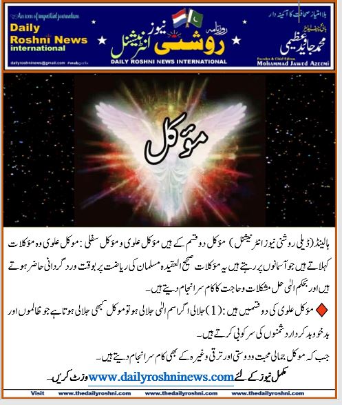 ہالینڈ(ڈیلی روشنی نیوز انٹرنیشنل )موکل علوی وہ مؤکلا ت کہلاتے ہیں جو آسمانوں پر رہتے ہیں یہ مؤکلات صحیح العقیدہ مسلمان کی ریاضت پر بوقت وردگردانی حاضر ہوتے ہیں اور بحکم الہٰی حل مشکلات و حاجت کا کام سرانجام دیتے ہیں ۔