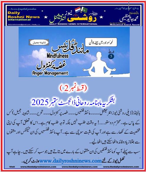 ہالینڈ(ڈیلی روشنی نیوز انٹرنیشنل ۔۔۔۔ مائنڈ فلنیس۔۔۔ غصہ پر کنٹرول۔۔۔ تحریر۔۔۔شاہینہ جمیل)کس کے پاس ہے۔محترم دوستو….! یہ وقت طلب نہیں بلکہ توجہ طلب کام ہے۔ اس کا تعلق آپ کی اپنی شخصیت کے نکھار سے ہے اور آپ کی مثبت سوچی سے ہے۔ آپ مائنڈ فلنسیس کی ان تیکنکس اور مشقوں سے جتنازیاد وفائدہ اٹھا سکتے ہیں اٹھا لیے۔