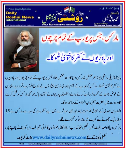 ہالینڈ(ڈیلی روشنی نیوز انٹرنیشنل )مارکس دنیا کا واحد شخص تھا ، جس پر یورپ کے تمام چرچوں اور پادریوں نے کفر کا فتویٰ ٹھوکا۔ مارکس کو یورپ کے تمام یہودی مذہبی پیشواؤں نے خارج المذہب قرار دیا۔ پیسوں کے عوض جنت کے ٹکٹ فروخت کرنے والے استحصالی پادریوں نے فتوی دیا کہ جو بھی مارکس کو قتل کرے گا، وہ جنت میں حضرت عیسیٰ علیہ السلام کے ساتھ ہوگا۔