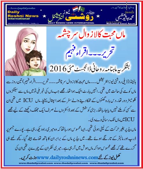 ہالینڈ(ڈیلی روشنی نیوز انٹرنیشنل ۔۔۔ ماں محبت کا لازوال سر چشمہ۔۔۔ تحریر۔۔۔اقراء فہیم)تین روز سے ماں کومے کی حالت میں تھی۔ انہیں ہارٹ اٹیک ہوا تھا۔ مجھے جب ماں کی خبر ملی تو میں ماں سے سینکڑوں کلومیٹر دور تھا۔ دس بارہ گھنٹوں کے تھکا دینے والےسفر کے بعد اسپتال پہنچا۔ ماں ICU میں تھی ان سے کسی کو ملنے نہیں دیا جارہا تھا۔ بڑی کوشش کے بعد ڈاکٹروں نے صرف ایک جھلک دیکھنے کے لیے مجھے ICU میں ماں تک رسائی دے دی۔
