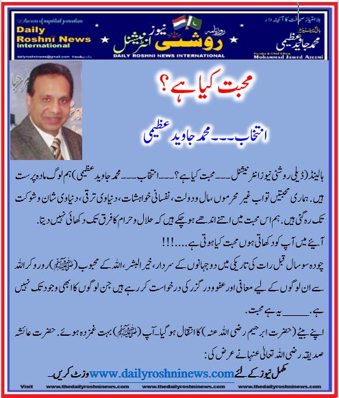 ہالینڈ(ڈیلی روشنی نیوز انٹرنیشنل ۔۔۔ محبت کیا ہے؟۔۔۔ انتخاب۔۔۔محمد جاوید عظیمی )ہم لوگ مادہ پرست ہیں. ہماری محبتیں تو اب غیر محرموں ،مال و دولت، نفسانی خواہشات، دنیاوی ترقی، دنیاوی شان و شوکت تک رہ گئی ہیں. ہم اس محبت میں اتنے اندھے ہو چکے ہیں کہ حلال و حرام کا فرق تک دکھائی نہیں دیتا.