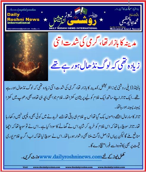 ہالینڈ(ڈیلی روشنی نیوز انٹرنیشنل )مدینہ کا بازار تھا ، گرمی کی شدت اتنی زیادہ تھی کہ لوگ نڈھال ہورہے تھے ۔ ایک تاجر اپنے ساتھ ایک غلام کو لیے پریشان کھڑا تھا ۔ غلام جو ابھی بچہ ہی تھا وہ بھی دھوپ میں کھڑ ا پسینہ پسینہ ہورہا تھا ۔