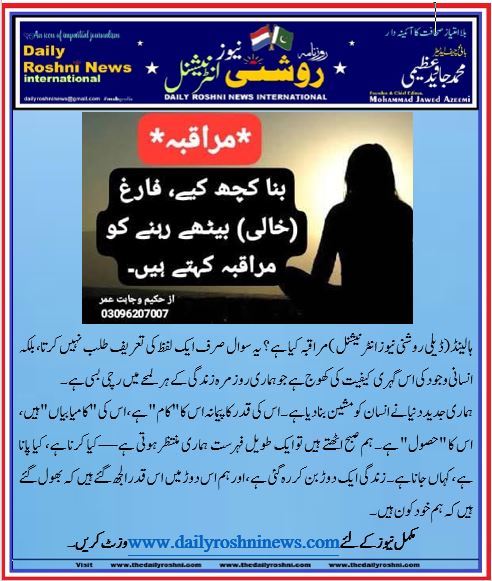 ہالینڈ(ڈیلی روشنی نیوز انٹرنیشنل )مراقبہ کیا ہے؟ یہ سوال صرف ایک لفظ کی تعریف طلب نہیں کرتا، بلکہ انسانی وجود کی اس گہری کیفیت کی کھوج ہے جو ہماری روزمرہ زندگی کے ہر لمحے میں رچی بسی ہے۔