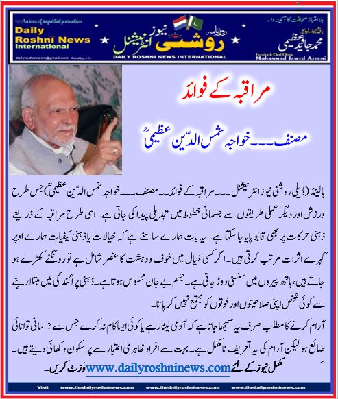 ہالینڈ(ڈیلی روشنی نیوز انٹرنیشنل ۔۔۔ مراقبہ کے فوائد۔۔ مصنف۔۔۔ خواجہ شمس الدّین عظیمیؒ)جس طرح ورزش اور دیگر عملی طریقوں سے جسمانی خطوط میں تبدیلی پیدا کی جاتی ہے۔ اسی طرح مراقبہ کے ذریعے ذہنی حرکات پر بھی قابو پایا جا سکتا ہے۔ یہ بات ہمارے سامنے ہے کہ خیالات یا ذہنی کیفیات ہمارے اوپر گہرے اثرات مرتب کرتی ہیں۔ اگر کسی خیال میں خوف و دہشت کا عنصر شامل ہے تو رونگٹے کھڑے ہو جاتے ہیں، ہاتھ پیروں میں سنسنی دوڑ جاتی ہے۔ جسم بے جان محسوس ہوتا ہے۔ ذہنی پراگندگی میں مبتلا رہنے سے کوئی شخص اپنی صلاحیتوں اور قوتوں کو مجتمع نہیں کر پاتا۔