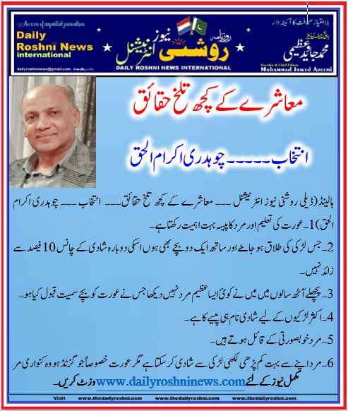 ہالینڈ(ڈیلی روشنی نیوز انٹرنیشنل ۔۔۔ معاشرے کے کچھ تلخ حقائق۔۔۔ انتخاب ۔۔۔ چوہدری اکرام الحق)1۔عورت کی تعلیم اور مرد کا پیسہ بہت اہمیت رکھتا ہے۔