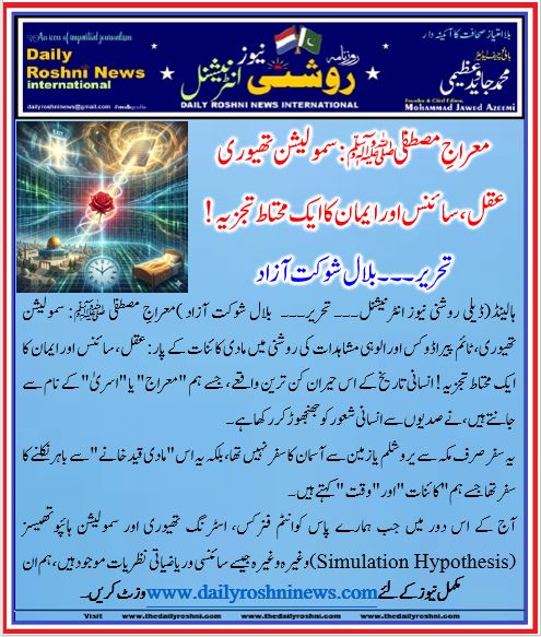 ہالینڈ(ڈیلی روشنی نیوز انٹرنیشنل۔۔۔ تحریر۔۔۔ بلال شوکت آزاد )معراجِ مصطفیٰ ﷺ: سمولیشن تھیوری، ٹائم پیراڈوکس اور الوہی مشاہدات کی روشنی میں مادی کائنات کے پار: عقل، سائنس اور ایمان کا ایک محتاط تجزیہ! – بلال شوکت آزاد