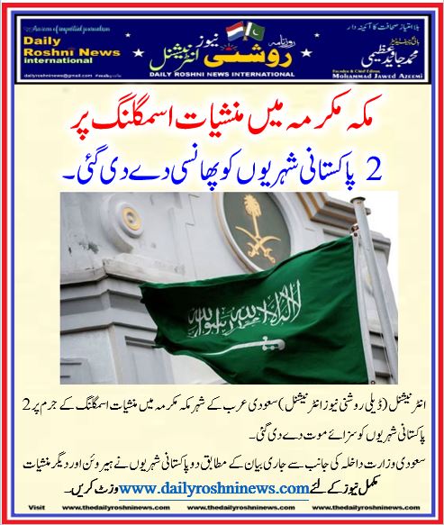 انٹرنیشنل (ڈیلی روشنی نیوز انٹرنیشنل )سعودی عرب کے شہر مکہ مکرمہ میں منشیات اسمگلنگ کے جرم پر 2 پاکستانی شہریوں کو سزائے موت دے دی گئی۔