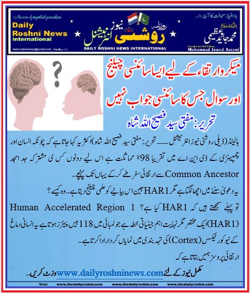 ہالینڈ(ڈیلی روشنی نیوز انٹرنیشنل ۔۔۔ تحریر: مفتی سید فصیح اللہ شاہ )اکثر یہ کہا جاتا ہے کہ چونکہ انسان اور چمپینزی کے ڈی این اے میں تقریبا 98٪ مماثلت ہے اس لیے دونوں کس ی مشترکہ جد امجد Common Ancestor سے ارتقائی سفر طے کر کے یہاں تک پہنچے۔