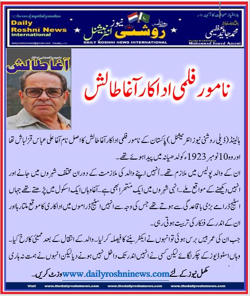 ہالینڈ(ڈیلی روشنی نیوز انٹرنیشنل )پاکستان کے نامور فلمی اداکار آغا طالش کا اصل نام آغا علی عباس قزلباش تھا اور وہ 10 نومبر 1923ء کو لدھیانہ میں پیدا ہوئے تھے۔