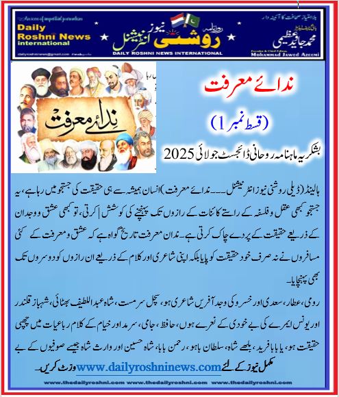 ہالینڈ(ڈیلی روشنی نیوز انٹرنیشنل )انسان ہمیشہ سے ہی حقیقت کی جستجو میں رہا ہے، یہ جستجو کبھی عقل و فلسفہ کے راستے کائنات کے رازوں تک پہنچنے کی کوشش | کرتی، تو کبھی عشق و وجدان کے ذریعےحقیقت کے پردے چاک کرتی ہے۔ ندان معرفت تاریخ گواہ ہے کہ عشق و معرفت کے کئی مسافروں نے نہ صرف خود حقیقت کو پایا بلکہ اپنی شاعری اور کلام کے ذریعے ان رازوں کو دوسروں تک بھی پہنچایا۔