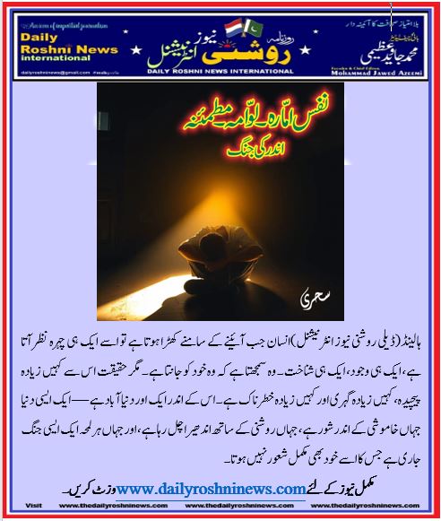انسان جب نفسِ امّارہ کی کھینچ اور نفسِ لوّامہ کی ملامت کے درمیان بار بار ٹوٹتا، سنبھلتا، گرتا اور اٹھتا ہے… تو ایک وقت ایسا بھی آتا ہے جب اس کے اندر کچھ خاموشی سے بدلنے لگتا ہے۔ یہ تبدیلی شور کے ساتھ نہیں آتی، نہ ہی کسی اعلان کے ساتھ۔ یہ ایک ایسی تدریجی کیفیت ہے جو انسان کے اندر اس وقت جنم لیتی ہے جب وہ اپنے آپ سے لڑتے لڑتے تھک چکا ہوتا ہے… مگر ہارا نہیں ہوتا۔