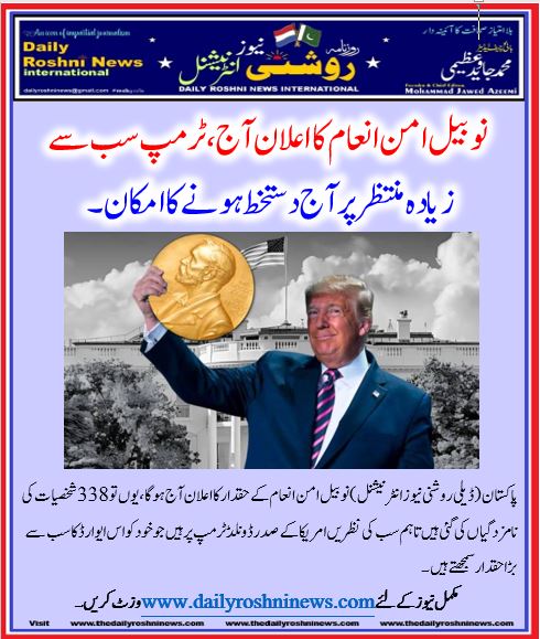 ہالینڈ(ڈیلی روشنی نیوز انٹرنیشنل )نوبیل امن انعام کےحقدارکااعلان آج ہوگا، یوں تو338 شخصیات کی نامزدگیاں کی گئی ہیں تاہم سب کی نظریں امریکا کے صدر ڈونلڈ ٹرمپ پر ہیں جو خود کو اس ایوارڈ کا سب سے بڑا حقدار سمجھتے ہیں۔