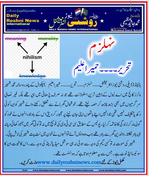 نہلزم لاطینی زبان کا لفظ ہے جس کے معنی ہیں کچھ نہیں۔انسانی فطرت ہے کہ وہ زندگی کے مقصد، حقیقت اورسچائی کی تلاش میں رہتا ہے۔یہی تلاش کبھی اسے رب تک پہنچا دیتی ہے تو کبھی اسے راہ سے اس قدر بھٹکا دیتی ہے کہ وہ اپنی جان تک لے لیتا ہے۔