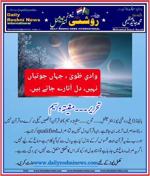 ہالینڈ(ڈیلی روشنی نیوز انٹرنیشنل۔۔۔ تحریر۔۔۔مقیتہ وسیم  )جو قرآن آنکھیں گیلی نہ کرے وہ قرآن نہیں رہتا،وہ صرف ترجمہ بن جاتا ہے۔ایسا قرآن دل نہیں بدلتا، صرف qualified کرتا ہے۔