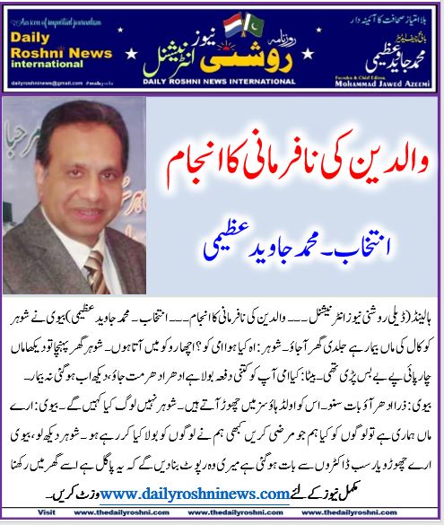 ہالینڈ(ڈیلی روشنی نیوز انٹرنیشنل ۔۔۔ والدین کی نافرمانی کا انجام۔۔۔ انتخاب ۔ محمد جاوید عظیمی)بیوی نے شوہر کو کال کی ماں بیمار ہے جلدی گھر آجاؤ ۔ شوہر : اہ کیا ہوا امی کو ؟ اچھا روکو میں آتا ہوں۔ شوہر گھر پہنچا تو دیکھا ماں چارپائی پے بے بس پڑی تھی ۔ بیٹا: کیا امی آپ کو کتنی دفعہ بولا ہے ادھر ادھر مت جاؤ ، دیکھ اب ہوگئی نہ بیمار ۔