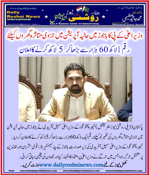 پاکستان(ڈیلی روشنی نیوز انٹرنیشنل )خیبرپختونخوا کے وزیراعلیٰ سہیل آفریدی نے باجوڑ میں حالیہ آپریشن میں جزوی متاثرہ گھروں کی تعمیر نو کیلئے رقم ایک لاکھ 60 ہزار سے بڑھا کر 5 لاکھ کرنے کا اعلان کردیا۔