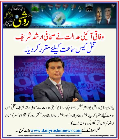 پاکستان (ڈیلی روشنی نیوز انٹرنیشنل )اسلام آباد: وفاقی آئینی عدالت نے صحافی ارشد شریف قتل کیس سماعت کیلئے مقرر کر دیا۔جسٹس عامرفاروق اور جسٹس روزی خان پر مشتمل دو رکنی بینچ 3 دسمبر کو صحافی ارشد شریف قتل کیس کی سماعت کرے گا۔