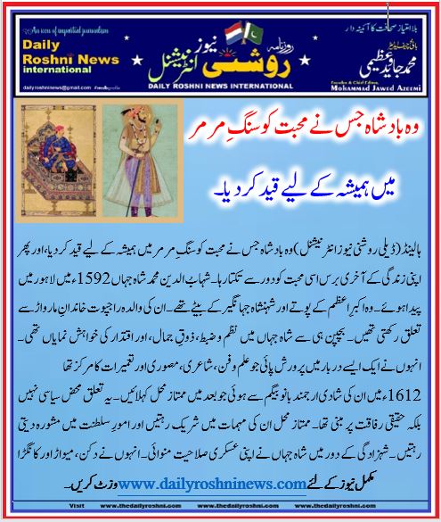 ہالینڈ(ڈیلی روشنی نیوز انٹرنیشنل )وہ بادشاہ جس نے محبت کو سنگِ مرمر میں ہمیشہ کے لیے قید کر دیا،اور پھر اپنی زندگی کے آخری برس اسی محبت کو دور سے تکتا رہا۔شہابُ الدین محمد شاہ جہاں 1592ء میں لاہور میں پیدا ہوئے۔ وہ اکبرِ اعظم کے پوتے اور شہنشاہ جہانگیر کے بیٹے تھے۔ ان کی والدہ راجپوت خاندانِ مارواڑ سے تعلق رکھتی تھیں۔ بچپن ہی سے شاہ جہاں میں نظم و ضبط، ذوقِ جمال، اور اقتدار کی خواہش نمایاں تھی۔ انہوں نے ایک ایسے دربار میں پرورش پائی جو علم و فن، شاعری، مصوری اور تعمیرات کا مرکز تھا