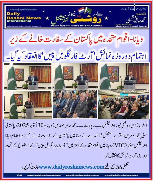 آسٹریا (ڈیلی روشنی نیوز انٹرنیشنل ۔۔۔رپورٹ۔۔۔ محمد عامر صدیق) ویانا – 30 اکتوبر 2025، پاکستانی سفیر محمد کامران اختر اور مستقل نمائندے نے ویانا میں پاکستان کے سفارت خانے کے زیر اہتمام ویانا انٹرنیشنل سینٹر (VIC)، ویانا میں اقوام متحدہ کے دفتر میں “آرٹ فار گلوبل پیس” کے موضوع کے تحت دو روزہ آرٹ نمائش کا افتتاح کیا۔