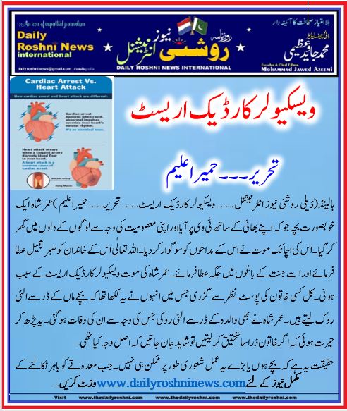 ہالینڈ(ڈیلی روشنی نیوز انٹرنیشنل ۔۔۔ ویسکیولر کارڈیک اریسٹ۔۔۔ تحریر۔۔۔حمیراعلیم )عمر شاہ ایک خوبصورت بچہ جو کہ اپنے بھائی کے ساتھ ٹی وی پر آیا اور اپنی معصومیت کی وجہ سے لوگوں کے دلوں میں گھر کر گیا۔اس کی اچانک موت نے اس کے مداحوں کو سوگوار کر دیا۔اللہ تعالٰی اس کے خاندان کو صبر جمیل عطا فرمائے اور اسے جنت کے باغوں میں جگہ عطا فرمائے۔عمر شاہ کی موت ویسکیولر کارڈیک اریسٹ کے سبب ہوئی۔