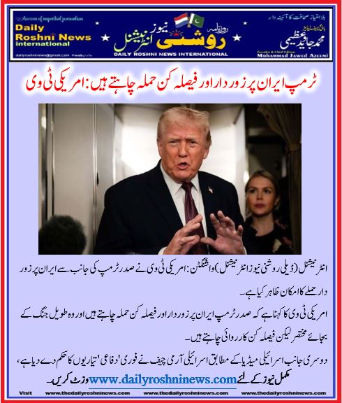 امریکی ٹی وی کا کہنا ہےکہ صدر ٹرمپ ایران پر زور دار اور فیصلہ کن حملہ چاہتے ہیں اور وہ طویل جنگ کے بجائے مختصر لیکن فیصلہ کن کارروائی چاہتے ہیں۔