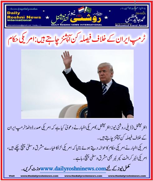 انٹرنیشنل (ڈیلی روشنی نیوز انٹرنیشنل )امریکی اخبار نے دعویٰ کیا ہے کہ امریکی صدر ڈونلڈ ٹرمپ ایران کے خلاف فیصلہ کن آپشنز چاہتے ہیں۔