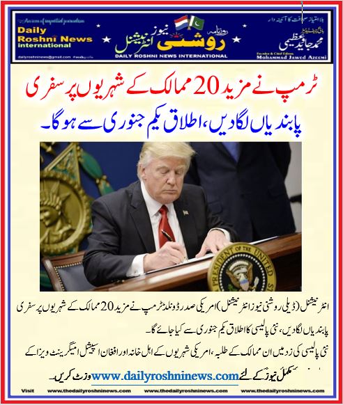 انٹرنیشنل (ڈیلی روشنی نیوز انٹرنیشنل )امریکی صدر ڈونلڈ ٹرمپ نے مزید 20 ممالک کے شہریوں پر سفری پابندیاں لگادیں، نئی پالیسی کا اطلاق یکم جنوری سےکیا جائےگا۔