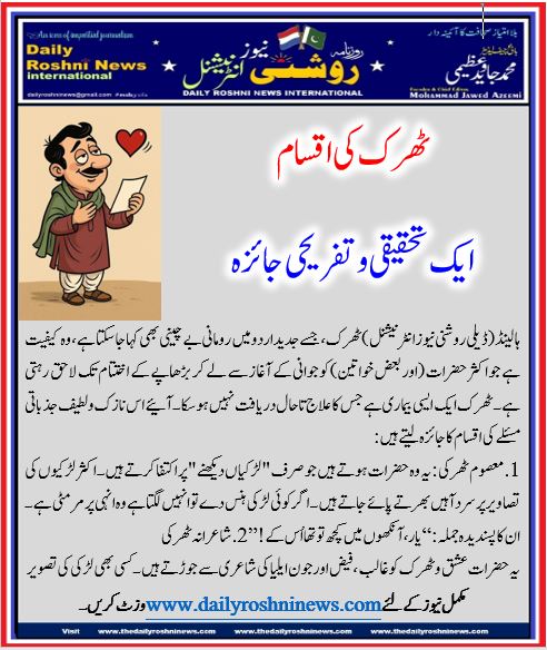 ہالینڈ(ڈیلی روشنی نیوز انٹرنیشنل )ٹھرک، جسے جدید اردو میں رومانی بےچینی بھی کہا جا سکتا ہے، وہ کیفیت ہے جو اکثر حضرات (اور بعض خواتین) کو جوانی کے آغاز سے لے کر بڑھاپے کے اختتام تک لاحق رہتی ہے۔ ٹھرک ایک ایسی بیماری ہے جس کا علاج تاحال دریافت نہیں ہوسکا ۔ آئیے اس نازک و لطیف جذباتی مسئلے کی اقسام کا جائزہ لیتے ہیں: