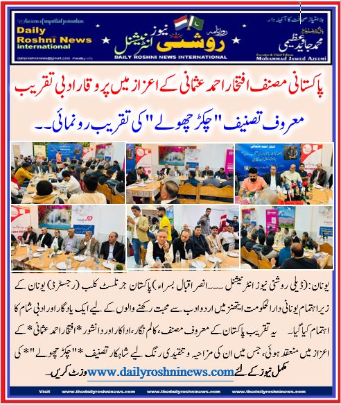 یونان:(ڈیلی روشنی نیوز انٹرنیشنل ۔۔۔انصر اقبال بسراء )پاکستان جرنلسٹ کلب (رجسٹرڈ) یونان کے زیراہتمام یونانی دارالحکومت ایتھنز میں اردو ادب سے محبت رکھنے والوں کے لیے ایک یادگار اور ادبی شام کا اہتمام کیا گیا۔