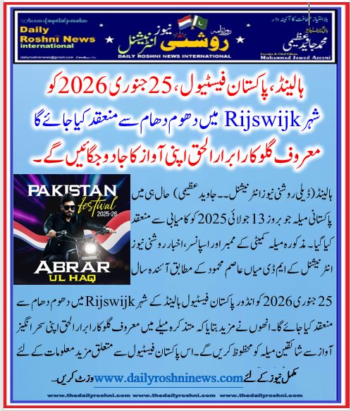 ہالینڈ(ڈیلی روشنی نیوز انٹرنیشنل ۔۔۔جاوید عظیمی) حال ہی میں پاکستانی میلہ جو بروز 13 جولائی 2025 کو کامیابی سے منعقد کیا گیا ۔ مذکورہ میلہ کمیٹی کے ممبر اور اسپانسر، اخبار روشنی نیوز انٹرنیشنل کے ایم ڈی میاں عاصم محمود کے مطابق آئندہ سال 25 جنوری 2026 کو انڈور پاکستان فیسٹیول ہالینڈ کے شہر رائس وائیک میں دھوم دھام سے منعقد کیا جائے گا۔ انھوں نے مزید بتایا کہ متذکرہ میلے میں معروف گلوکار ابرار الحق اپنی سحر انگیز آواز سے شائقین میلہ کو محظوظ کریں گے ۔اس پاکستان فیسٹیول سے متعلق مزید معلومات کے لئے خبر کے نیچے شائع کئے گئے پوسٹر کا مطالعہ کریں۔