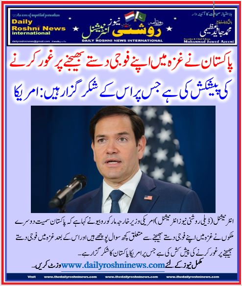 انٹرنیشنل (ڈیلی روشنی نیوز انٹرنیشنل )امریکی وزیر خارجہ مارکو روبیو نے کہا ہے کہ پاکستان سمیت دوسرے ملکوں نے غزہ میں اپنے فوجی دستے بھیجنے سے متعلق کچھ سوال پوچھے ہیں اور اس کے بعد غزہ میں فوجی دستے بھیجنے پر غور کرنے کی پیش کش کی ہے جس پر امریکا پاکستان کا شکر گزار ہے۔