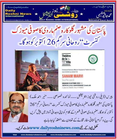 پیرس (ڈیلی روشنی نیوز انٹرنیشنل ۔۔۔نمائندہ خصوصی ۔۔۔ منیر احمد ملک) پاکستان کی مشہور گلوکارہ صنم ماروی کا صوفی میوزک کنسرٹ “روحانی سرگم” 26 اکتوبر کو ہوگا۔صنم ماروی صوفی شعرا کے کلام کو اپنی وجدانی آواز میں پیش کریں گی۔یہ پروگرام پاکستانی سفارتخانے کے تعاون سے منعقد کیا جا رہا ہے