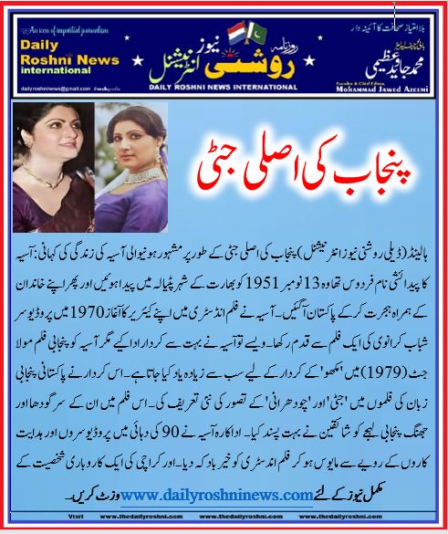 ہالینڈ(ڈیلی روشنی نیوز انٹرنیشنل )پنجاب کی اصلی جٹی کے طور پر مشہور ہونیوالی آسیہ کی زندگی کی کہانی:  آسیہ کا  پیدائشی نام فردوس تھا وہ 13 نومبر 1951 کو بھارت کے شہر پٹیالہ میں پیدا ہوئیں اور پھراپنے خاندان کے ہمراہ ہجرت کرکے پاکستان آگئیں۔ آسیہ نے  فلم انڈسٹری میں اپنے  کیئریر کا آغاز 1970 میں  پروڈیوسر شباب کرانوی کی ایک فلم سے قدم رکھا۔ویسے تو آسیہ نے بہت سے کردار ادا کیے مگر آسیہ کو پنجابی فلم مولا جٹ (1979) میں ‘مکھو’ کے کردار کے لیے سب سے زیادہ یاد کیا جاتا ہے۔ اس کردار نے پاکستانی پنجابی زبان کی فلموں میں ‘جٹی’ اور ‘چودھرانی’ کے تصور کی نئی تعریف کی۔ اس فلم میں ان کے  سرگودھا اور جھنگ پنجابی لہجے کو  شائقین نے بہت پسند کیا۔   اداکارہ آسیہ نے 90  کی دہائی میں  پروڈیوسروں اور ہدایت کاروں کے رویے سے مایوس ہو کر  فلم اندسٹری کو خیرباد کہ دیا ۔اور کراچی کی ایک کاروباری شخصیت کے ساتھ شادی کرکے اپنی ساری توجہ اپنے گھر اور خاندان پر مرکوز کردی ۔۔ پہلے وہ سنگاپور چلی گئیں لیکن آخر کار کینیڈا کو اپنا گھر بنا لیا۔ انڈسٹری چھوڑنے کے بعد وہ کبھی بھی انڈسٹری کے لوگوں سے رابطے میں نہیں آئیں اور نہ ہی پاکستان میں فلم انڈسٹری میں دوبارہ آنے کی کوشش کی۔ ان کی دو بیٹیاں ہیں۔9 مارچ 2013  کو انکا  کینیڈا میں انتقال ہو گیا۔ان کی عمر 61 سال تھی۔ان کی مقبول فلموں میں مولا جٹ، وحشی جٹ، وڈاخان، سہرے کے پھول، شیر خان، پہلی نظر اور چار خون دے پیاسے شامل ہیں۔