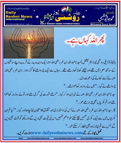 ہالینڈ(ڈیلی روشنی نیوز انٹرنیشنل )سید نا عبد اللہ بن عمر رضی اللہ عنہ ایک دن مدینہ کے قریب اپنے ساتھیوں کے ساتھ صحرا میں تھے اور بیٹھے کھانا کھا رھے تھے.. وہاں سے ایک چرواھے کا گزر ہوا.. ابن عمر رضی اللہ عنہ نے اُسے کھانے کی دعوت دی..